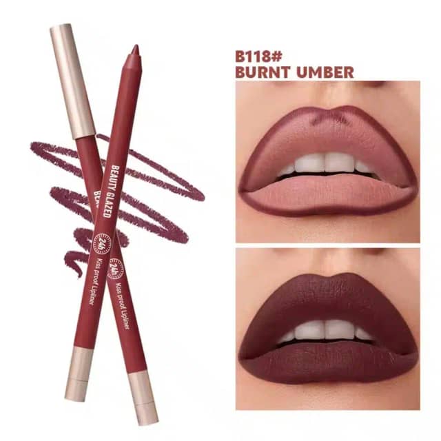 Define your pout with precision using Beauty Glazed's Waterproof & Long Lasting Lipliner Pencil in B118 Burnt Umber. This rich, enduring formula glides on smoothly, ensuring your lip color stays perfectly in place all day. Achieve a sculpted, sophisticated lip outline that lasts.